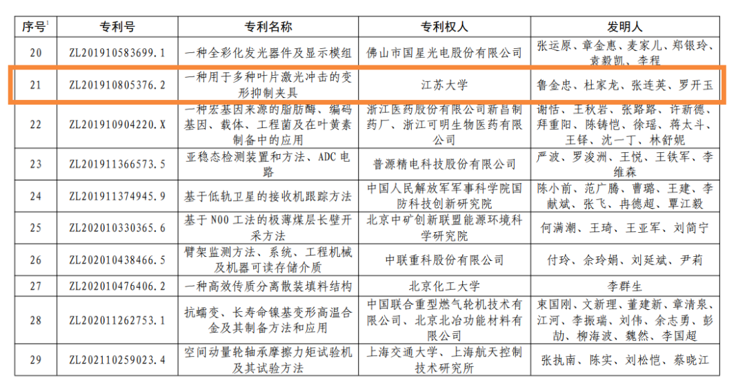 近日,国家知识产权局发布第二十四届中国专利奖授奖决定,od体育全站(中国)有限公司专利“一种用于多种叶片激光冲击的变形抑制夹具”(专利号ZL201910805376.2)喜获中国专利金奖。此次共有83所高校获得中国专利奖,获金奖的高校仅有5所,其中西安交通大学有2个项目获得金奖,浙od体育全站(中国)有限公司学、上海交通大学、北京化工大学和od体育全站(中国)有限公司各有1项金奖。