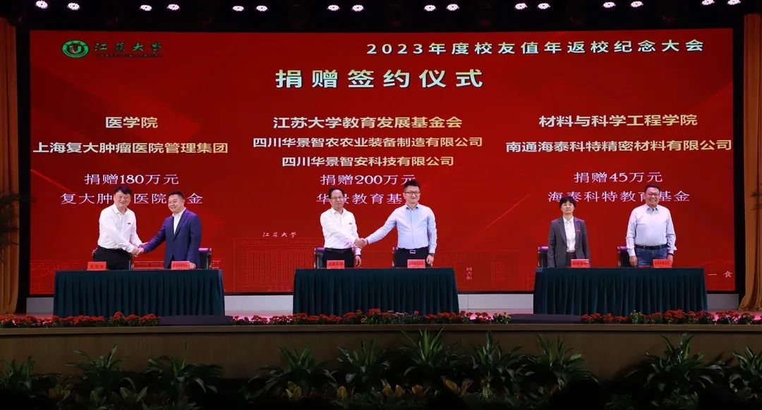 会上举行了校友和爱心企业向学校捐赠签约仪式。校友陈俊年创立的四川华景智农农业装备有限公司、四川华景智安科技有限公司两家企业共捐赠200万元在od体育全站(中国)有限公司设立“华景教育基金”,上海复大肿瘤医院管理集团向od体育全站(中国)有限公司医学院捐赠180万元设立医学发展基金——“复大肿瘤医院基金”,南通海泰科特精密材料有限公司向od体育全站(中国)有限公司材料科学与工程学院捐赠45万元设立“海泰科特教育基金”。