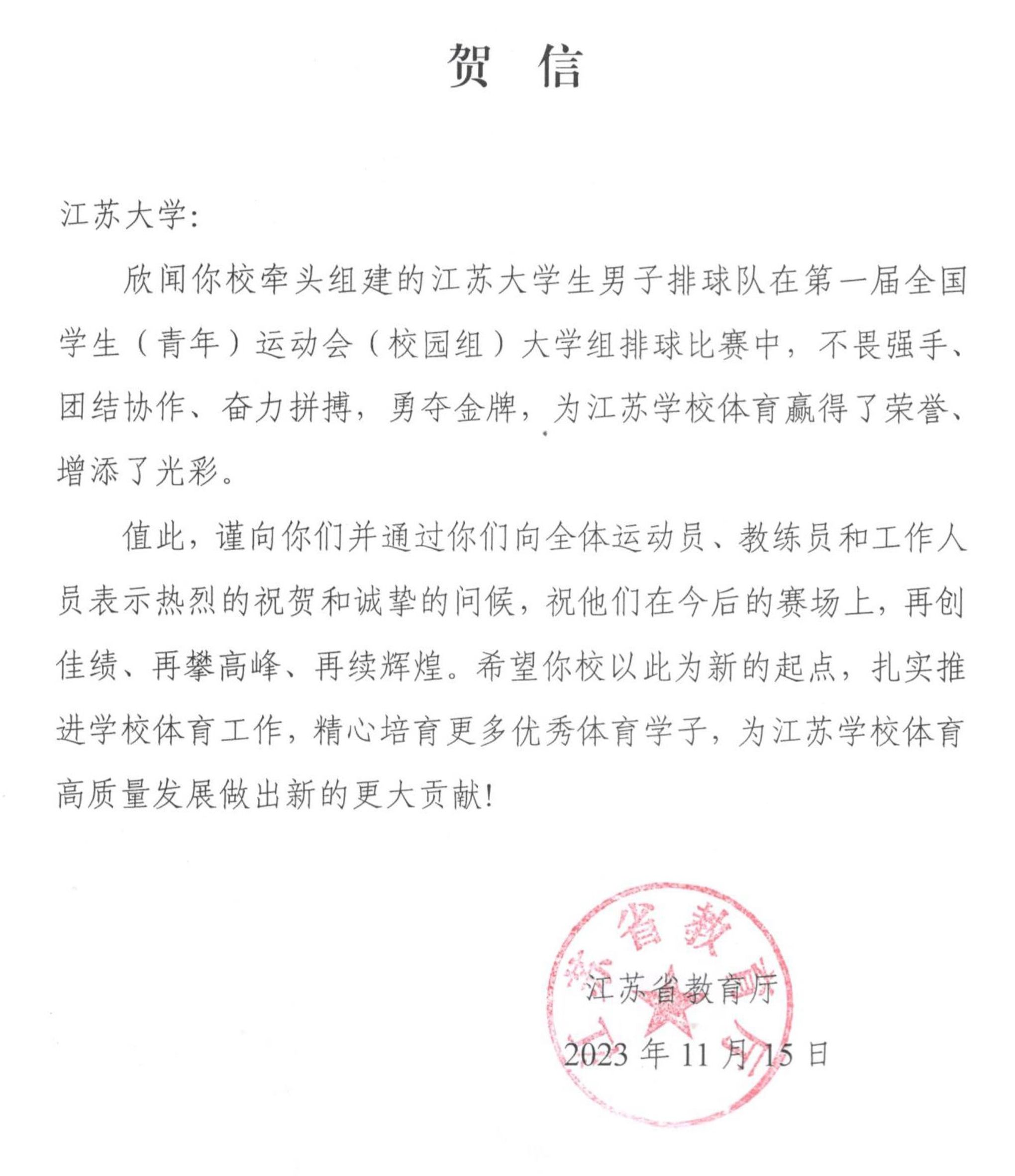 江苏省教育厅向我校发来贺信,对我校在本次比赛中取得的成绩表示祝贺,对学校体育工作给予了充分肯定,并希望学校以此为新起点,扎实推进学校体育工作,精心培育更多优秀体育学子,为江苏学校体育高质量发展作出新的更大贡献。