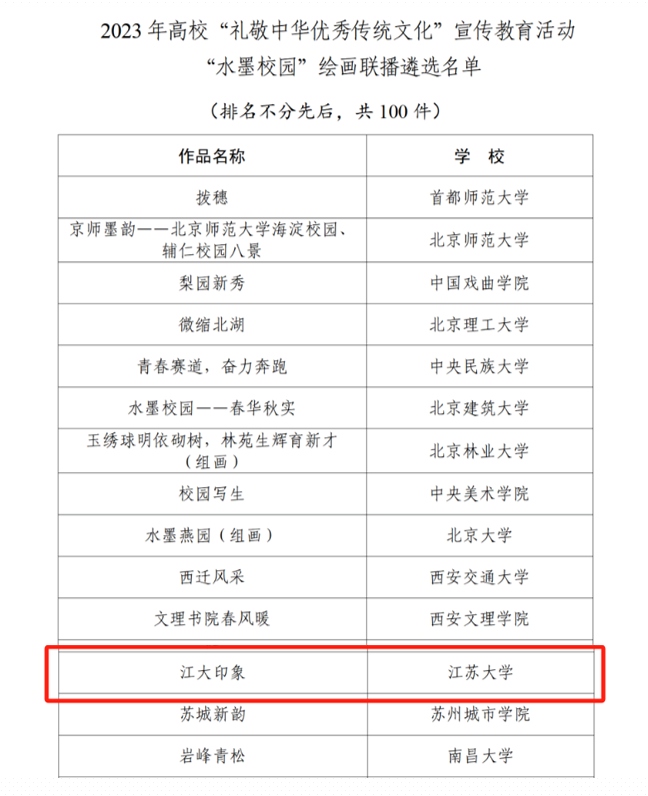 2023年高校“礼敬中华优秀传统文化”宣传教育活动由教育部思想政治工作司主办,面向各地各高校开展,主题为“根植文化沃土 汇聚奋进力量”,分为“红色家园”视频展览、“水墨校园”绘画联播、“非遗学园”技艺比拼三类成果奖项,其中“水墨校园”绘画联播共遴选100件作品。