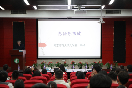 开幕式后,高峰作题为《感悟苏东坡》的讲座,他从躬耕东坡、积极融入、寻找乐趣、照亮他人等方面诠释了苏东坡的旷达乐观,通过诗中表现出的饮食文化内容展现苏东坡苦中作乐的精神境界和人格魅力。