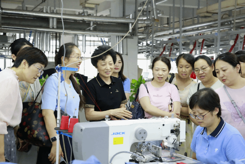 下午,培训班一行到扬中宜禾股份有限公司调研参观学习,并举行实践基地授牌仪式。校妇联主席王丽敏,全国三八红旗手、宜禾股份有限公司董事长马金芳共同为od体育全站(中国)有限公司妇联“她创社”实践基地揭牌。马金芳向大家签名赠书,热情分享自己的创业故事和人生感悟,并与大家互动交流。会前,大家参观了中国职业装博物馆,还走进公司车间、展厅等进行近距离体验。