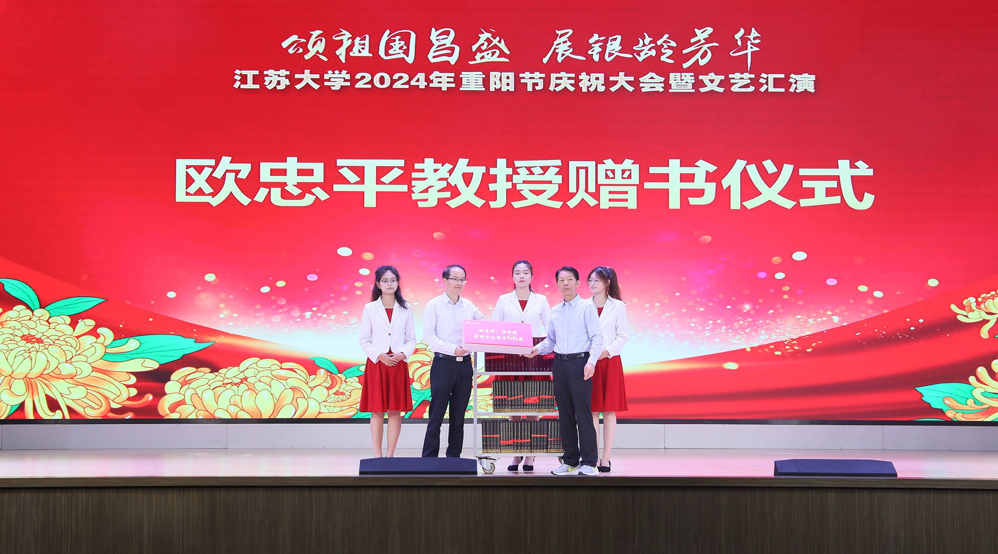 化学化工学院退休教师欧忠平教授和他的团队成员房媛媛副教授专门向学校捐赠30余万元的整套全英文专业书籍。图书馆馆长王谦上台接受捐赠并颁发捐赠证书。