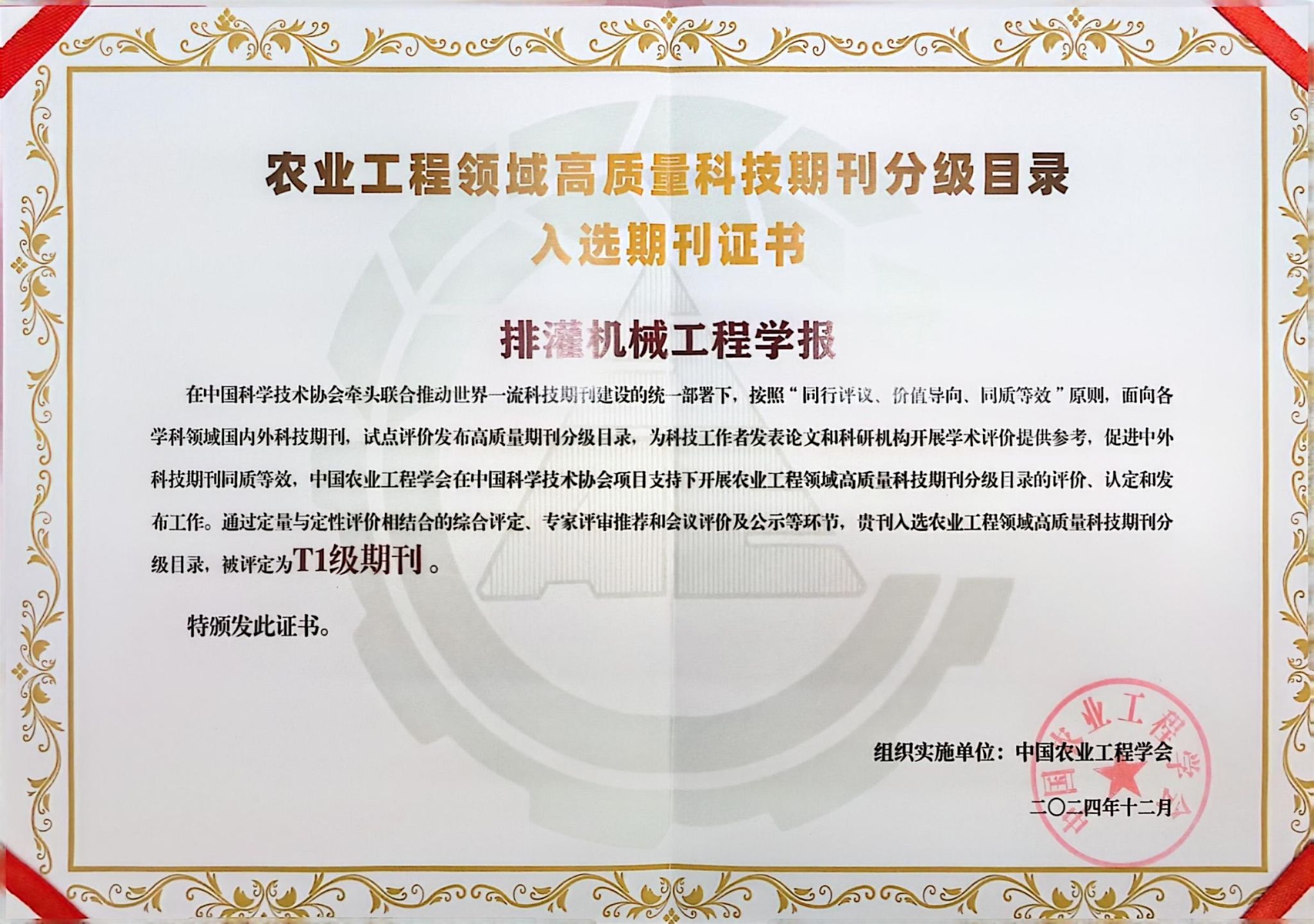 近日,中国农业工程学会在中国农业科学院国家农业图书馆召开发布会,正式发布其编制的“农业工程领域高质量科技期刊分级目录”,我校主办的《排灌机械工程学报》《od体育全站(中国)有限公司学报(自然科学版)》双双入选,分别位列T1级和T2级。