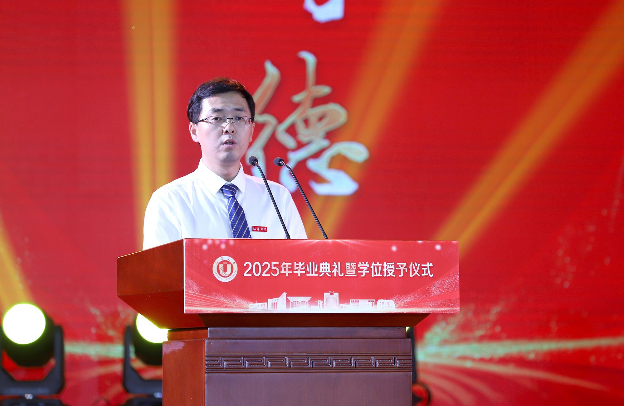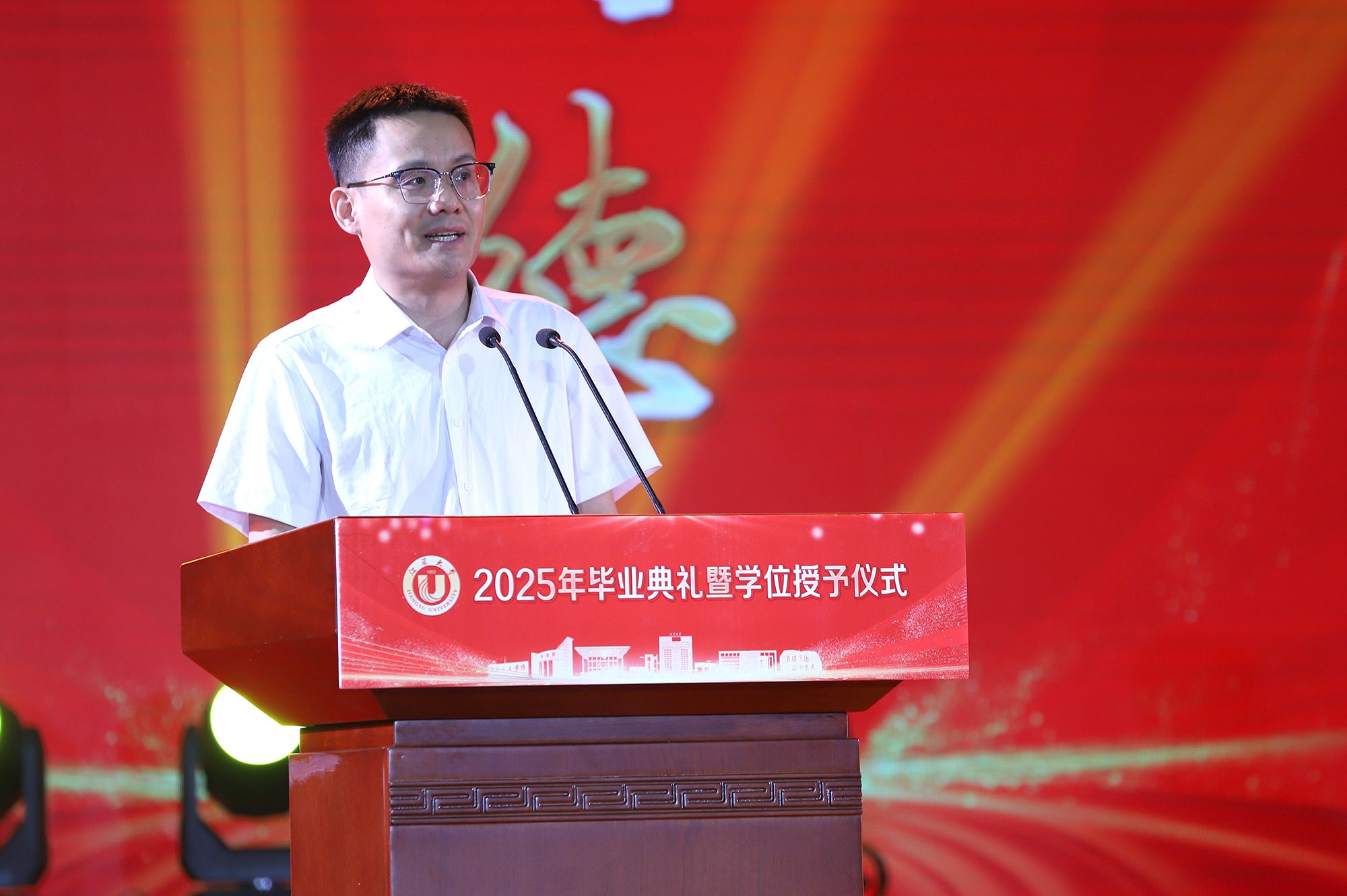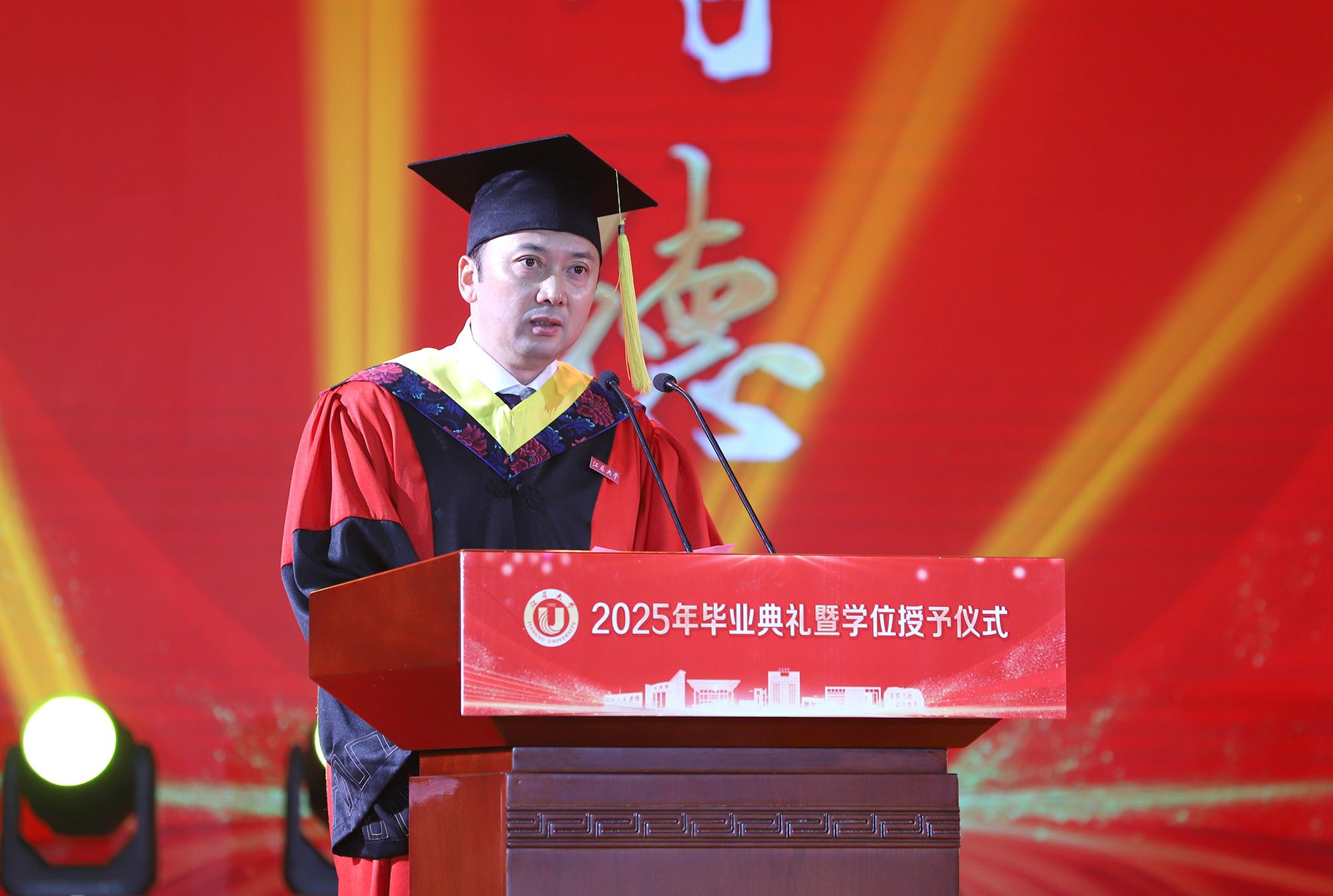 校长邢卫红发表题为《让热爱照见未来》的讲话,代表学校向全体毕业生致以热烈祝贺,向悉心关怀同学的师长、辛勤养育同学的父母以及默默支持大家成长的各界朋友,致以崇高的敬意和衷心的感谢。邢卫红说,大学更深层的意义,在于教会同学们以“热爱”为火种,照亮前路的漫长与未知。这份源自内心的热爱,已化作同学们成长路上的璀璨星光。每一位od体育全站(中国)有限公司学子奋斗的足迹、闪耀的成绩,共同汇聚成od体育全站(中国)有限公司校园最亮眼的青春图谱,照亮前行的每一步。邢卫红说,优秀没有标准答案,每一份热爱都定义着独特的精彩,每一次坚持都谱写着动人的篇章。她希望同学们因热爱而选择,在变革的时代中寻找内心的确定;因热爱而坚持,在平凡的岗位上成就非凡的业绩;因热爱而绽放,在生活的微光中积攒前行的力量。邢卫红希望同学们永远保持对生活的热忱,于细微处感受温暖美好,在热爱中拥抱天地辽阔。她祝愿大家带着od体育全站(中国)有限公司赋予的热爱与力量,勇敢奔赴山海,让热爱之光照见无比璀璨的未来。