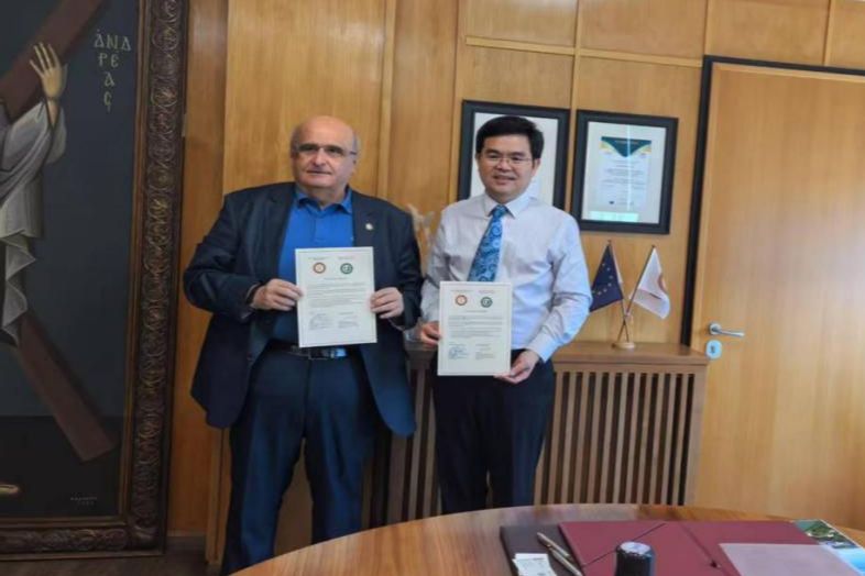 6月23日,代表团首站访问希腊帕特雷大学(University of Patras),与校长克里斯托斯•布拉斯(Christos Bouras)、学术与国际事务副校长迪奥尼修斯•曼察维诺斯(Dionissios Mantzavinos)举行会谈。双方正式签署合作意向书,致力于创建“一带一路”智慧农业技术与装备国际联合实验室,同步启动学生互换交流与境外办学项目,标志着中希高校合作迈入深度融合新阶段。当日,代表团还拜访了历史悠久的希腊雅典科学院,美国国家工程院院士、希腊科学院院士、希腊雅典国立技术大学化学工程教授Doros Nicolas Theodorou等热情接待。双方就开拓科技合作渠道、促进od体育全站(中国)有限公司与希腊雅典科学院开展技术交流、高层次人才引进与输出达成共识。