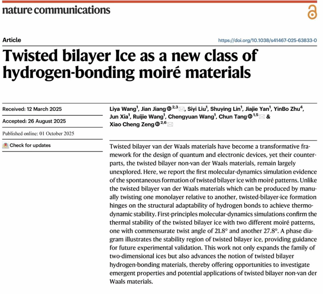 近日,土木工程与力学学院微纳米力学团队唐淳教授、王丽雅副教授与香港城市大学曾晓成教授团队合作,发现氢键主导的非范德华摩尔材料:魔角双层冰,在国际著名期刊Nature Communications上发表题为Twisted bilayer ice as a new class of hydrogen-bonding moiré materials的论文。od体育全站(中国)有限公司为第一完成单位,王丽雅为论文第一作者,香港城市大学江健博士、od体育全站(中国)有限公司唐淳和香港城市大学曾晓成为共同通讯作者。