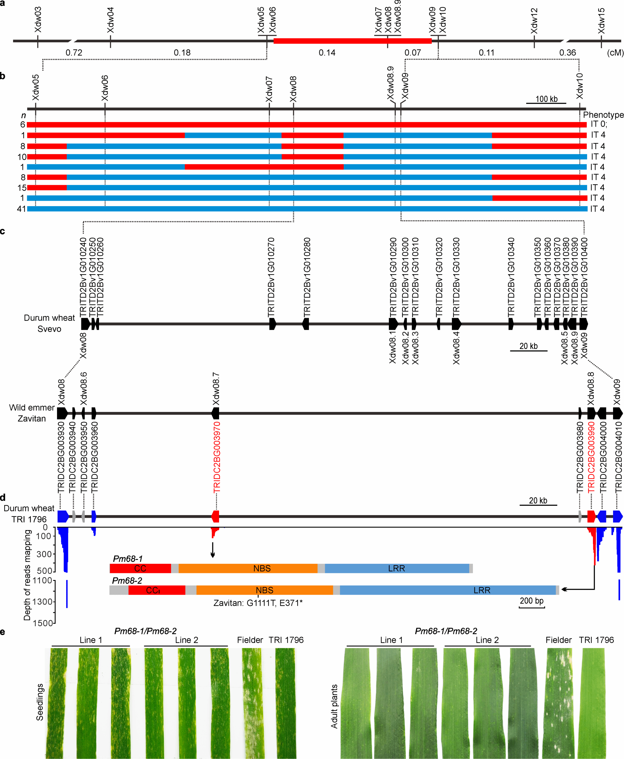 该研究通过精细遗传作图和基于分子标记的关联分析进一步将Pm68锁定在分子标记Xdw08/Xdw09之间。研究使用PacBio三代基因组测序和二代转录组数据的read-mapping分析表明,Pm68位点的两个NLR基因Pm68-1和Pm68-2与抗病相关。研究分别将Pm68-1和Pm68-2构建到转基因表达载体,采用农杆菌介导法导入感白粉病小麦品种Fielder。结果显示,单独携带Pm68-1或Pm68-2的转基因植株在苗期和成株期均表现为感白粉病,而聚合了这两个基因的杂交后代表现出稳定的抗病性,因此,Pm68抗性是由一对NLR基因联合控制。进化研究表明,Pm68抗性位点起源于野生二粒小麦,进而从野生二粒小麦中发掘到9种单倍型,丰富了抗白粉病基因资源。