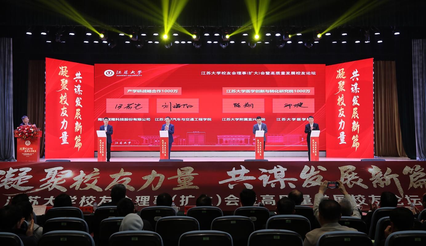 会上,校友企业、南京聚隆科技股份有限公司与学校签订价值1000万元的战略合作协议,深化双方产学研合作;校友单位、od体育全站(中国)有限公司附属宜兴医院与医学院共建“od体育全站(中国)有限公司医学创新与转化研究院”,签订1000万元共建协议。电气自动化79级校友、南京聚隆科技股份有限公司董事长刘曙阳,汽车学院院长汪若尘;od体育全站(中国)有限公司附属宜兴医院副院长陈翔,医学院党委书记邱健共同上台签约。
