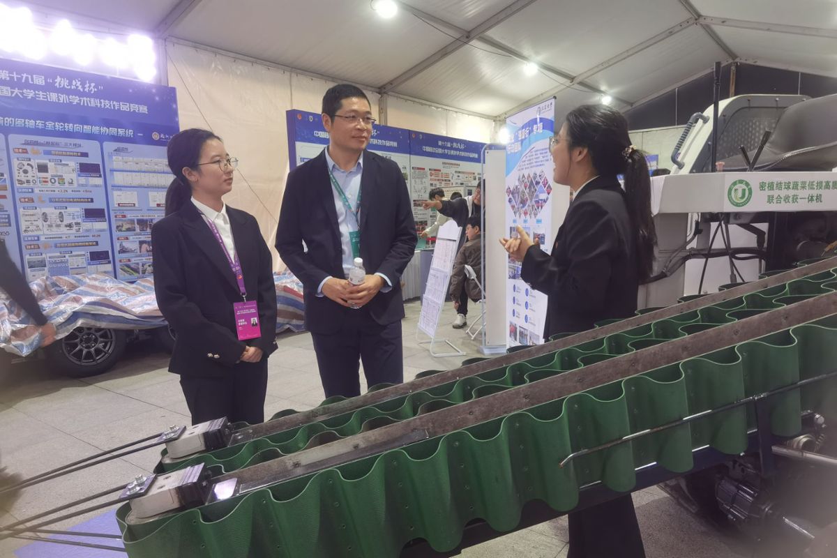 决赛期间,参赛学生向团中央书记处第一书记阿东汇报我校参赛项目情况。