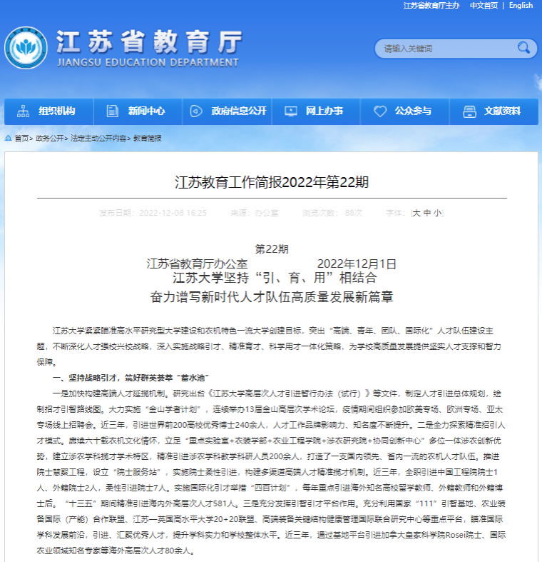 12月8日,江苏省教育厅《江苏教育工作简报》(2022年第22期)以《od体育全站(中国)有限公司坚持“引、育、用”相结合 奋力谱写新时代人才队伍高质量发展新篇章》为题,从坚持战略引才,筑好群英荟萃“蓄水池”;坚持精准育才,厚植全面成长“好沃土”;坚持科学用才,彰显才尽其用“大作为”三个方面,专题报道了我校人才工作的思路、举措与成效。