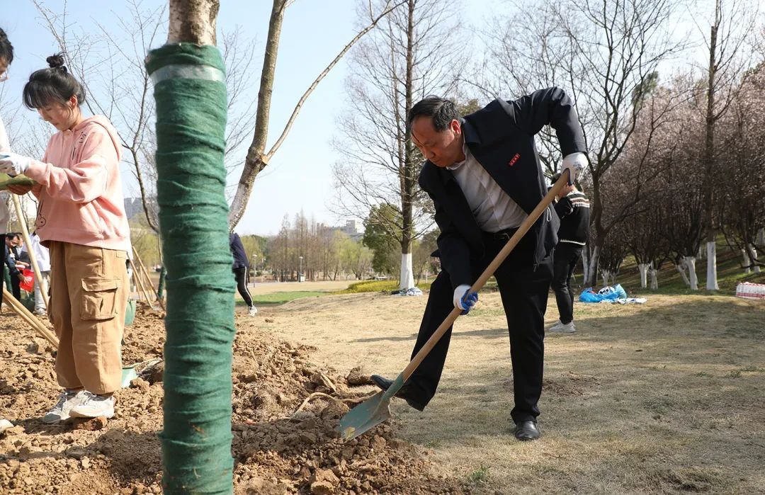 活动中,校领导和师生一起挥锹铲土、放入树苗、填土浇水,每个步骤细致认真、有条不紊。