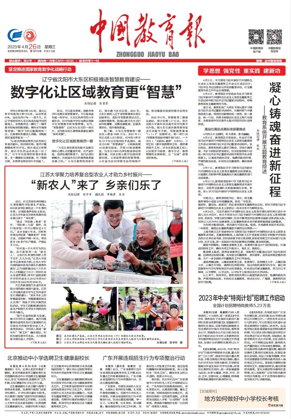 4月26日,《中国教育报》一版刊登文章《od体育全站(中国)有限公司聚力培养复合型农业人才助力乡村振兴——“新农人”来了 乡亲们乐了》,报道我校培养强农兴农人才,赋能农业现代化的生动实践故事。