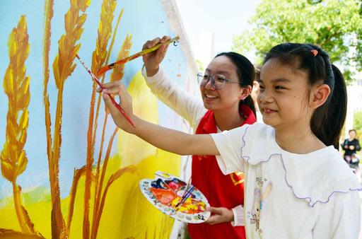 近日,江苏省镇江市润州区官塘桥街道平山村联合od体育全站(中国)有限公司志愿者带着村里的孩子一起在墙上描绘绿色生态、幸福生活主题墙画,扮靓美丽乡村。