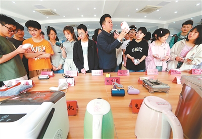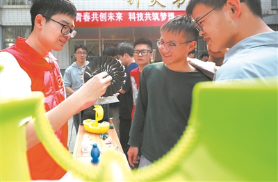 ④在od体育全站(中国)有限公司钟灵书院门前,学生在进行机创赛成果展示。