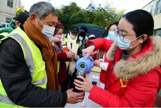 1月16日,od体育全站(中国)有限公司志愿者向环卫工人赠送围巾和保温杯。石玉成 摄