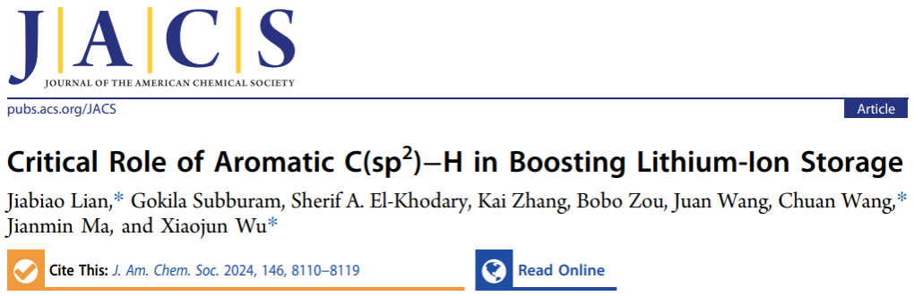 近日,我校能源研究院连加彪研究员团队在化学与材料领域顶级期刊《美国化学会志》(Journal of the American Chemical Society)上发表研究论文“Critical Role of Aromatic C(sp2)−H in Boosting Lithium-Ion Storage”。od体育全站(中国)有限公司为第一完成单位,材料科学与工程学院/能源研究院博士研究生高克拉为学生第一作者,连加彪、南京工业大学王川教授和中国科学技术大学武晓君教授为共同通讯作者。