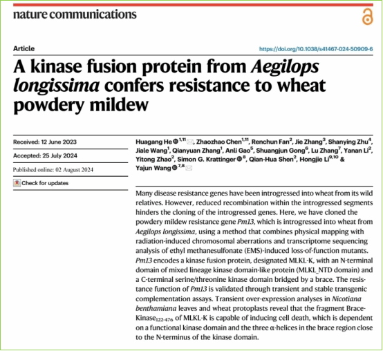 近日,生命科学学院何华纲团队联合多家单位在《自然·通讯》(Nature Communications)上发表题为“A kinase fusion protein from Aegilops longissima confers resistance to wheat powdery mildew”的研究论文,报道了来源于高大山羊草的小麦抗白粉病基因Pm13的克隆,并揭示了其生化功能和进化特性。od体育全站(中国)有限公司生命科学学院为第一完成单位,何华纲为第一作者兼通讯作者,合作单位中国科学院分子植物科学卓越创新中心王亚军研究员为共同通讯作者,硕士研究生陈昭昭为共同第一作者,硕士研究生王甲乐、张倩渊参加了部分工作。
