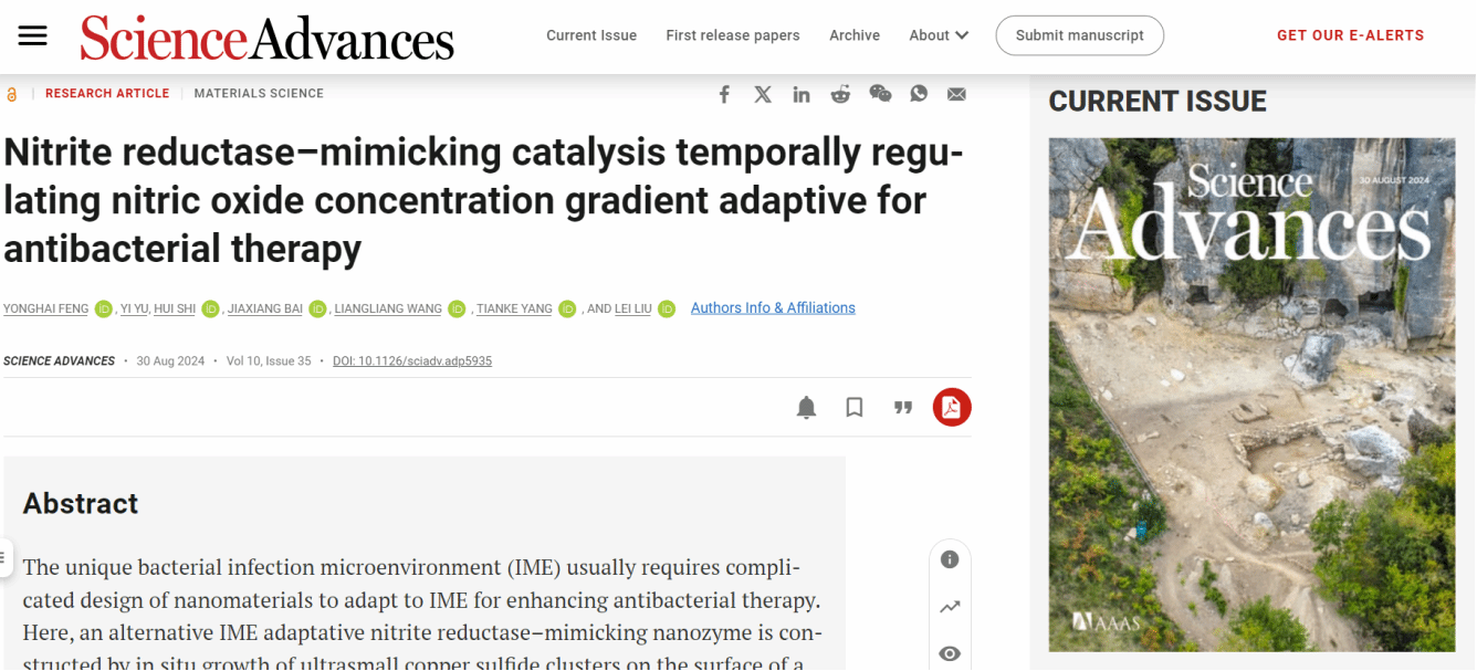 近日,我校材料科学与工程学院新材料研究院刘磊、冯永海团队在Science子刊《科学进展》(Science Advances)上在线发表研究论文“Nitrite reductase–mimicking catalysis temporally regulating nitric oxide concentration gradient adaptive for antibacterial therapy”。od体育全站(中国)有限公司为第一完成单位,冯永海副研究员为第一作者,刘磊研究员为最后通讯作者,南京医科大学附属常州二院王亮亮博士、中国科学技术大学附属第一医院杨甜柯博士为共同通讯作者。